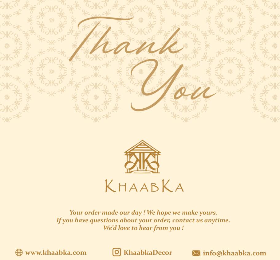 Unveil the allure with our Gateway Card, positioned at the heart of the Majestic Ensemble. This card serves as the key to the world of Khaabka, were every stitch tells us the story of sophistication. A thoughtfully designed Thank You Card accompanies each cushion cover, expressing our sincere thanks for choosing Khaabka.